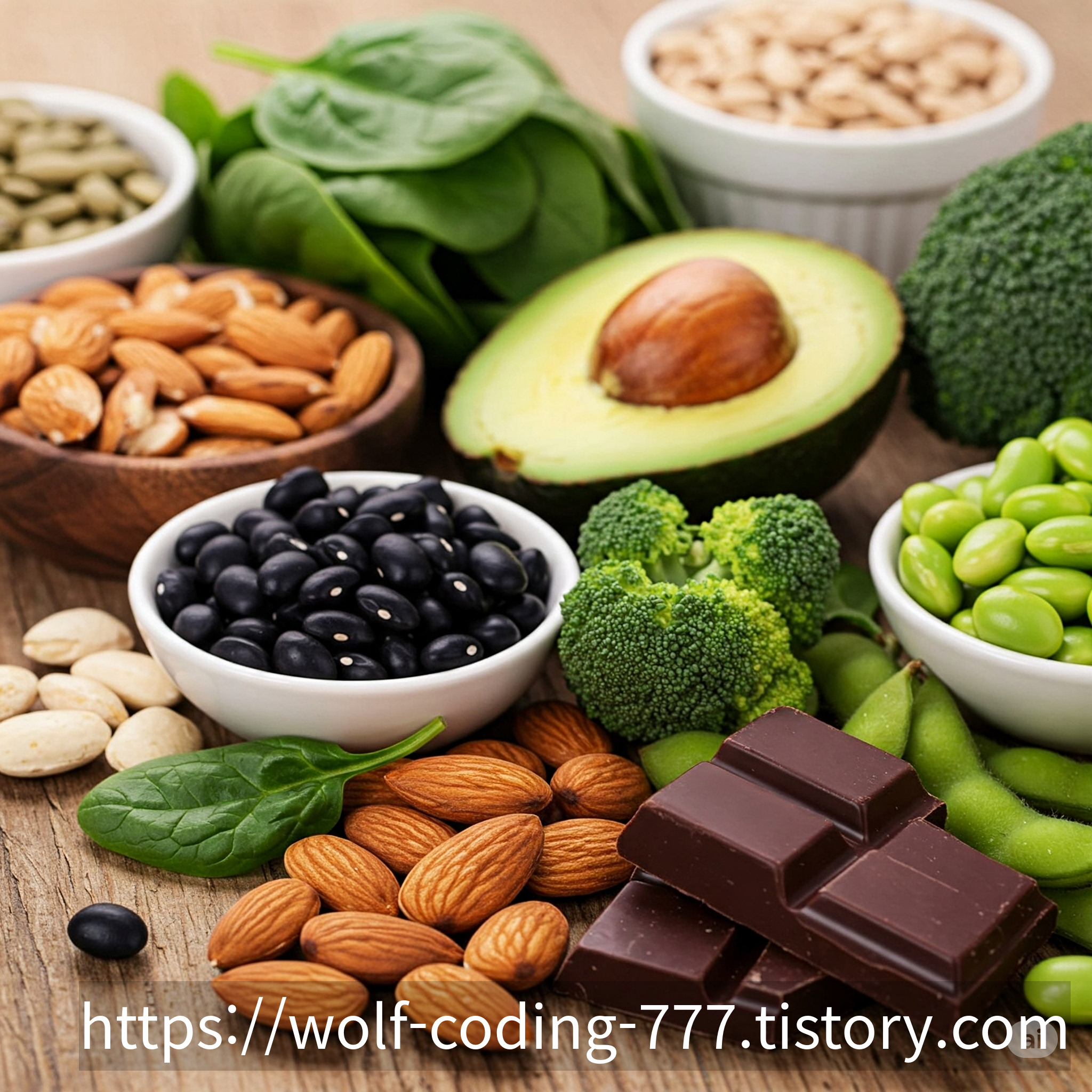 - 견과류와 씨앗: 아몬드, 호박씨 (1온스 아몬드 ≈ 80mg)