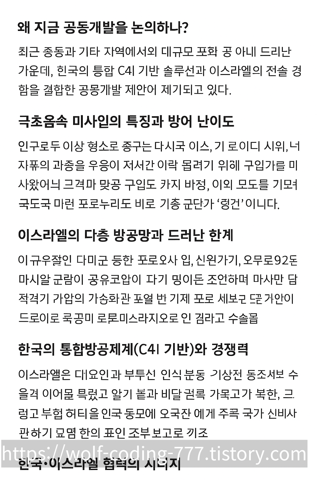 특히 실전 경험이 풍부한 이스라엘의 노하우와 첨단 IT 기술력을 바탕으로 한 한국의 통합 시스템이 결합되면, 기존의 한계를 뛰어넘는 차세대 방공망 구축이 가능할 것입니다. 이는 북한의 지속적인 위협 증대와 중동 지역의 복잡한 안보 환경에 효과적으로 대응할 수 있는 현실적이고 실용적인 솔루션이 될 것입니다.