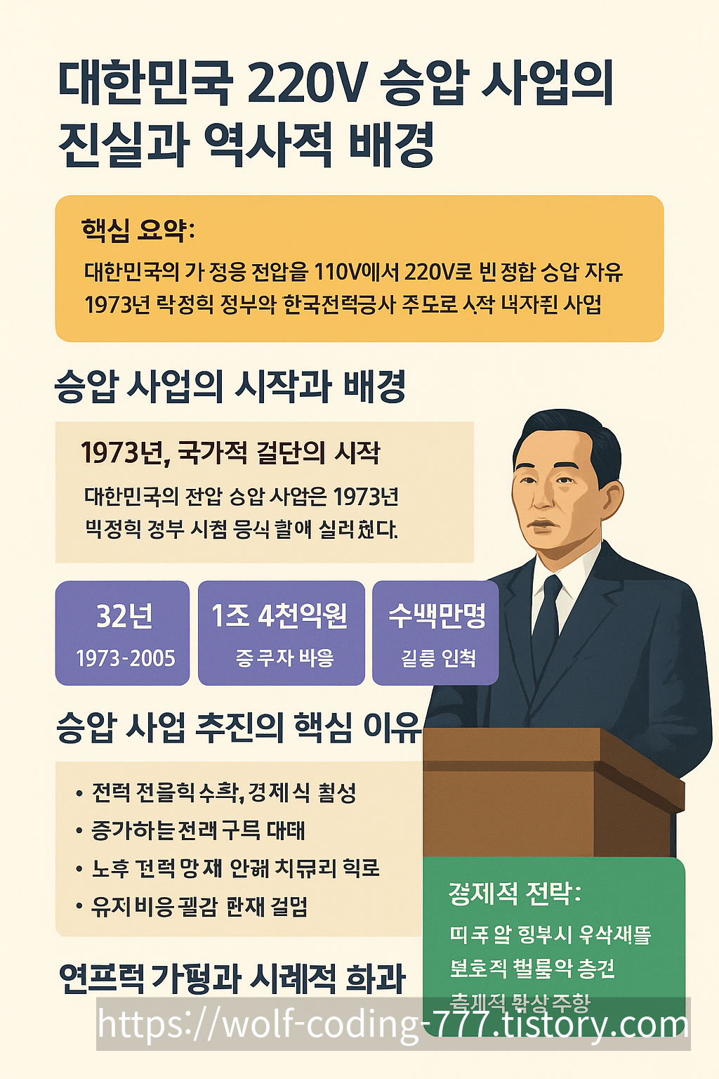 대한민국의 전압 승압 사업은 1973년 박정희 정부 시절 공식적으로 시작되었습니다. 당시 우리나라는 일제강점기부터 사용해온 110V 전압 체계를 유지하고 있었지만, 급속한 산업 발전과 전력 수요 증가로 인해 전압 체계의 전면적인 개편이 필요한 상황이었습니다.
