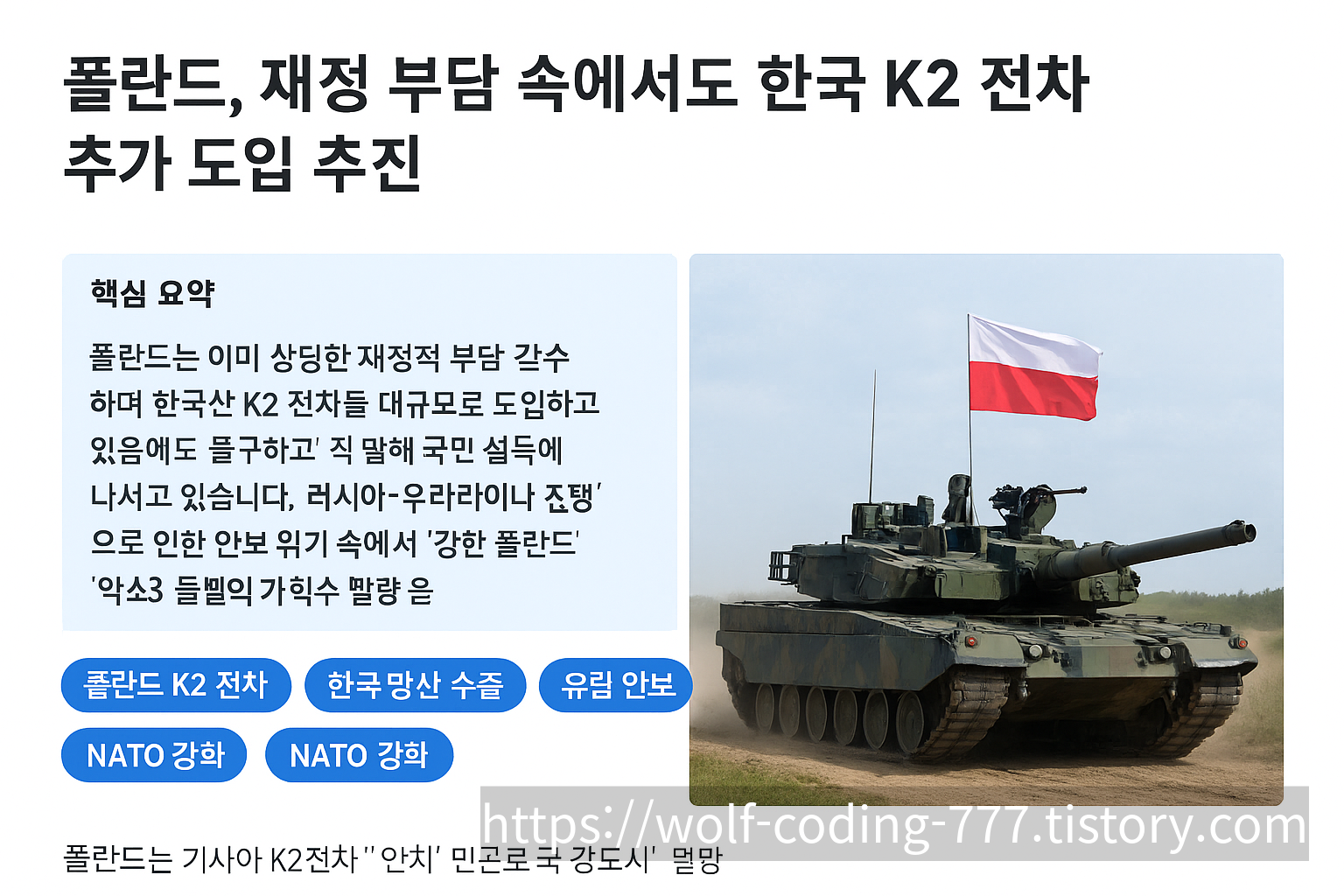주목할 점: 폴란드의 K2 전차 도입은 서방 무기체계 위주였던 기존 패러다임에서 아시아 무기체계로의 다변화를 보여주는 상징적 사례로 평가됩니다.