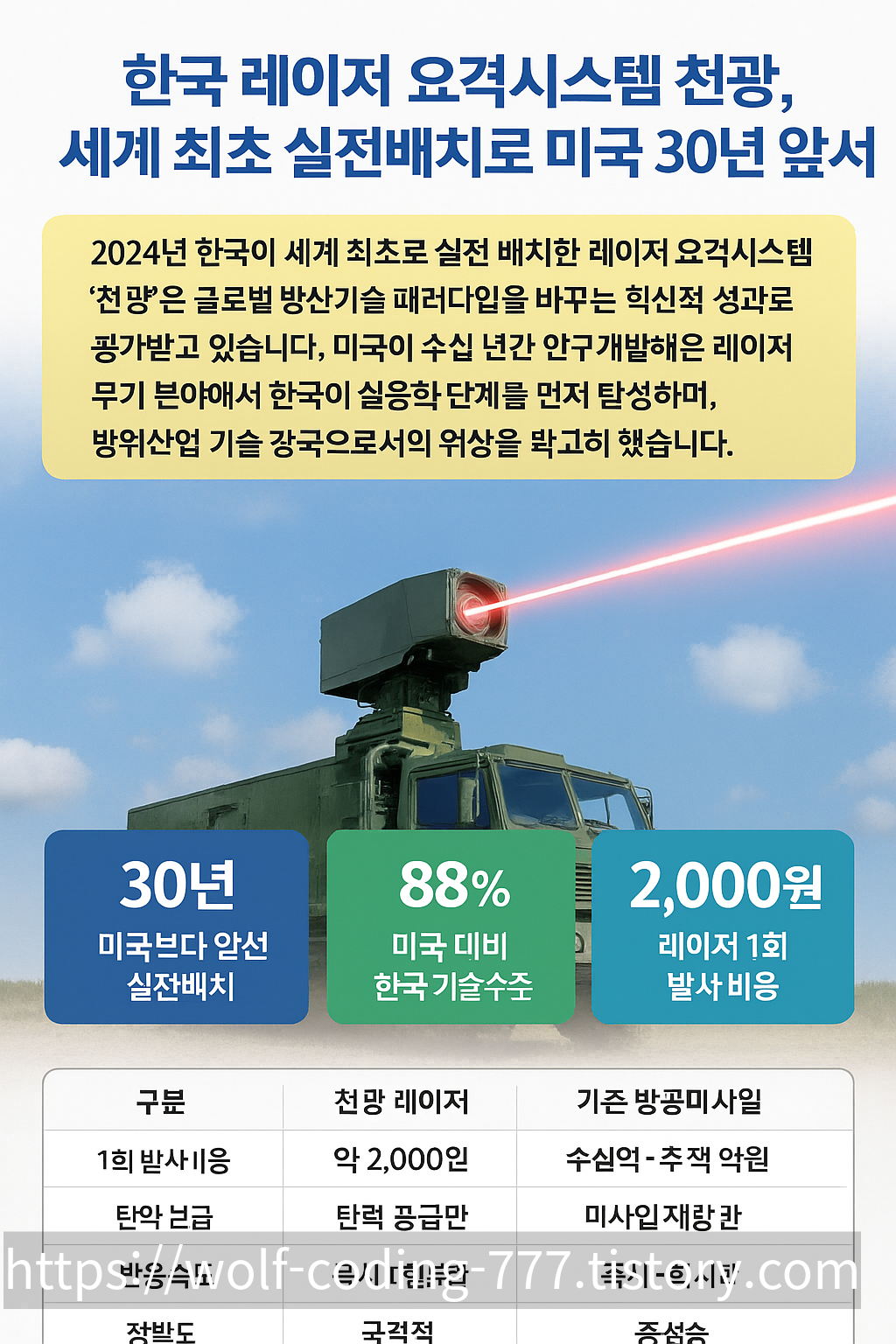 한국 레이저 요격시스템 천광, 세계 최초 실전배치로 미국 30년 앞서