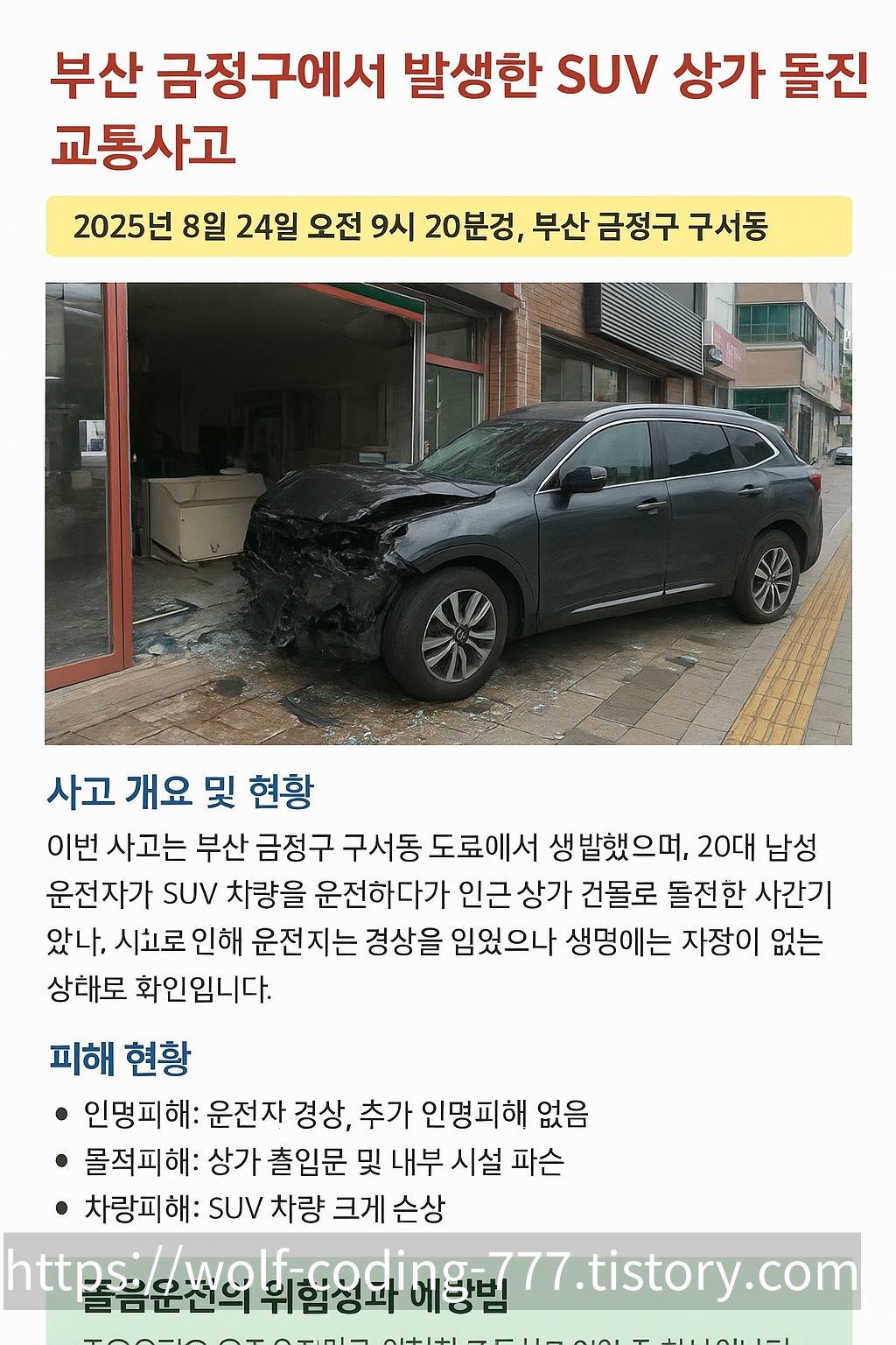 이번 부산 금정구에서 발생한 SUV 상가 돌진 사고는 졸음운전의 위험성을 다시 한번 보여주는 사례입니다. 다행히 큰 인명피해는 없었지만, 자칫 대형 참사로 이어질 수 있었던 상황이었습니다.