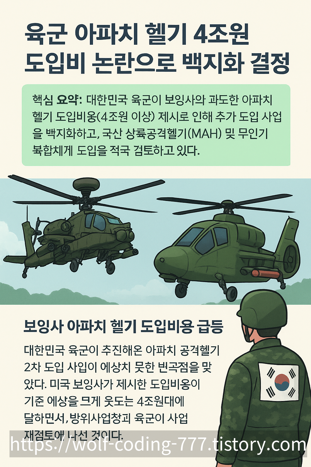 대한민국 육군이 추진해온 아파치 공격헬기 2차 도입 사업이 예상치 못한 변곡점을 맞았다. 미국 보잉사가 제시한 도입비용이 기존 예상을 크게 웃도는 4조원대에 달하면서, 방위사업청과 육군이 사업 재검토에 나선 것이다.