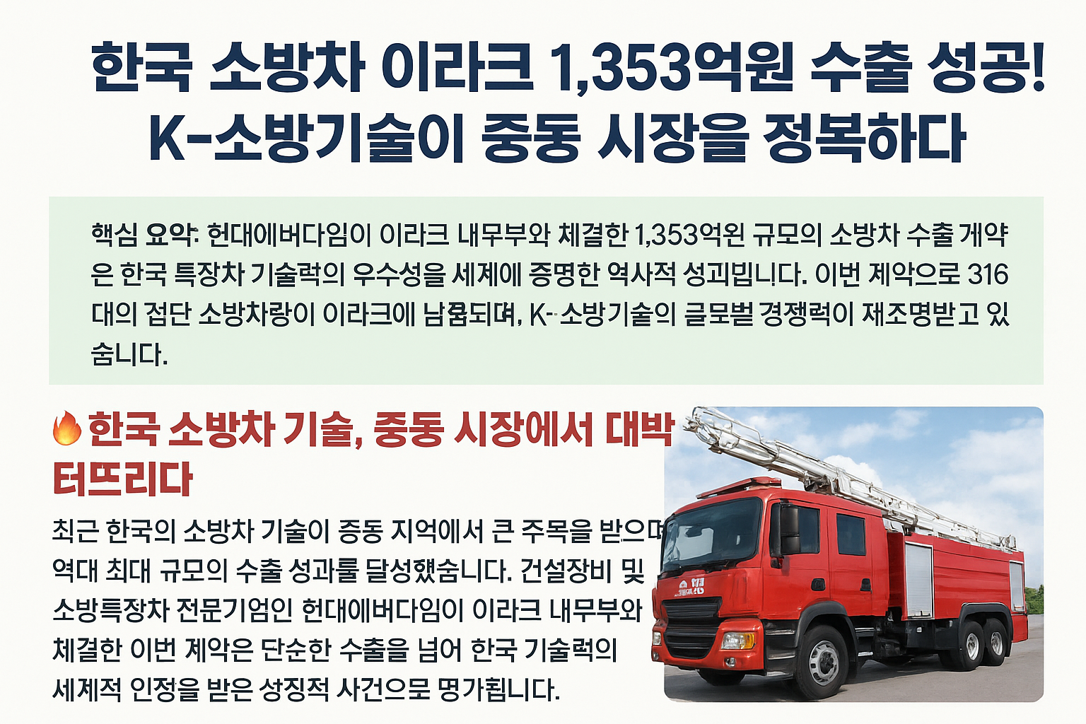 한국 소방차 이라크 1,353억원 수출 성공! K-소방기술이 중동 시장을 정복하다
