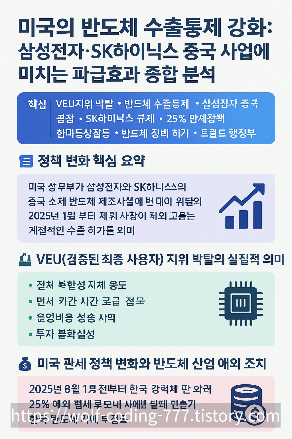 미국 상무부가 삼성전자와 SK하이닉스의 중국 소재 반도체 제조시설에 대한 '검증된 최종 사용자(Valid End-User, VEU)' 지위를 2025년 1월부터 제외하기로 결정했습니다. 이는 두 기업이 중국 공장에 미국산 반도체 장비를 도입할 때마다 개별적인 수출 허가를 받아야 함을 의미하며, 기존의 간소화된 승인 절차에서 벗어나 복잡한 심사 과정을 거쳐야 합니다.