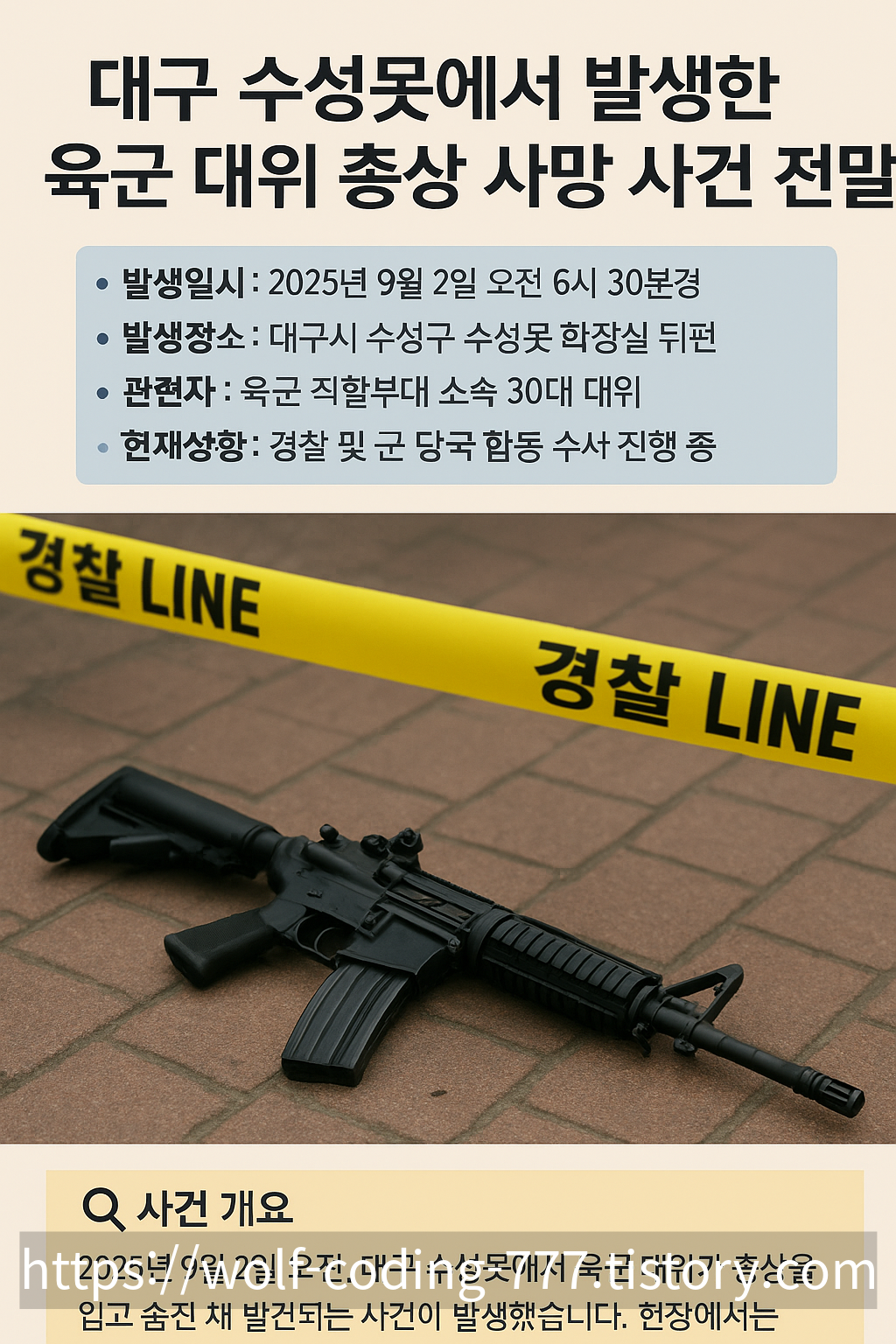 | 대구 수성못 육군 대위 총상 사망 사건 - 군용 소총 관리 실태 논란 (40) | 2025.09.02 |