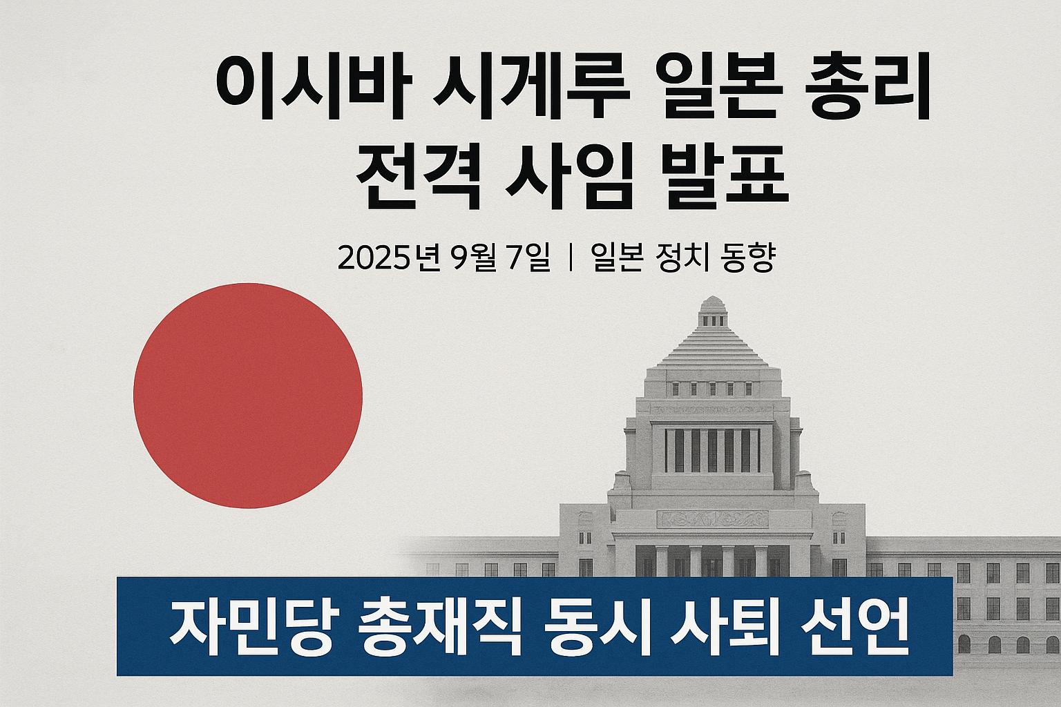 이시바 시게루 일본 총리가 2025년 9월 7일 긴급 기자회견을 통해 자민당 총재직과 총리직에서 동시 사임할 것을 공식 발표했습니다. 7월 참의원 선거 패배 이후 지속된 당내 퇴진 압력과 과반 지지 상실이 사임의 주요 배경으로 분석됩니다.