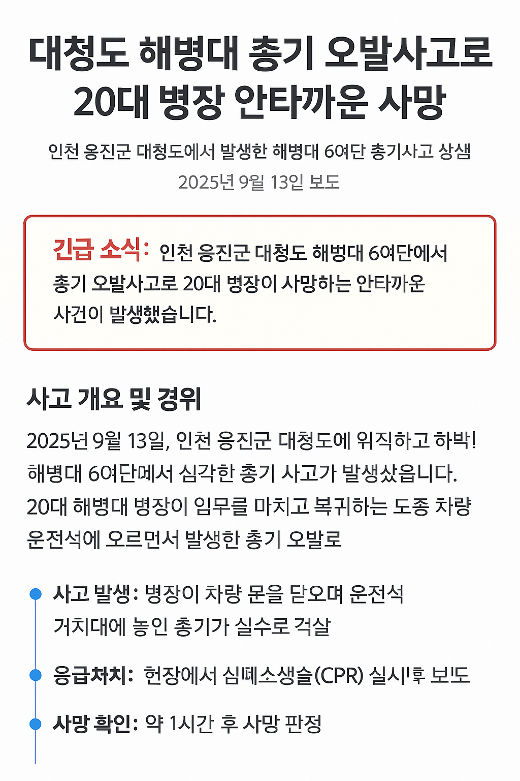 2025년 9월 13일, 인천 옹진군 대청도에 위치한 해병대 6여단에서 심각한 총기 사고가 발생했습니다.
