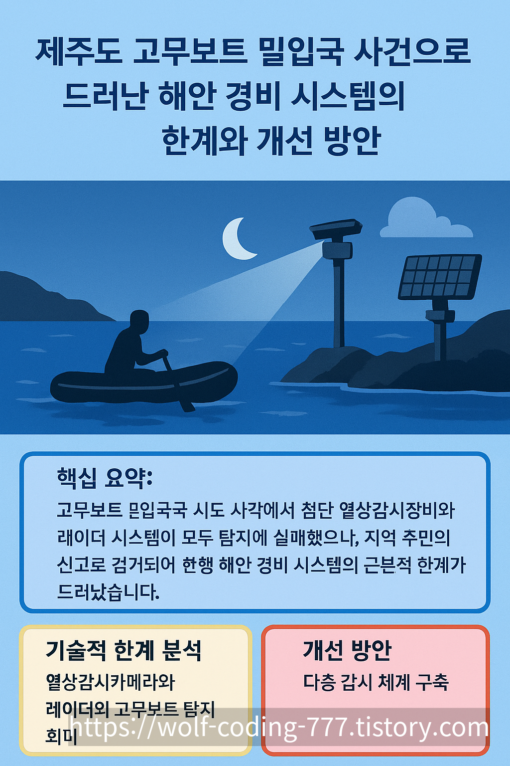 제주도에서 발생한 이번 고무보트 밀입국 사건은 우리나라 해안 경비의 현주소를 적나라하게 보여준 사례입니다. 40여 대의 첨단 열상감시카메라와 레이더 시스템이 모두 무력화된 상황에서, 결국 한 주민의 신고가 사건 해결의 열쇠가 되었다는 점은 많은 시사점을 제공합니다.