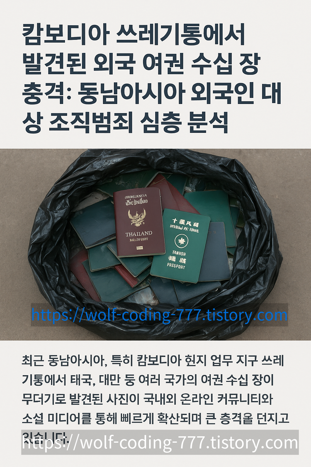 최근 동남아시아, 특히 캄보디아 현지 업무 지구 쓰레기통에서 **태국, 대만 등 여러 국가의 여권 수십 장**이 무더기로 발견된 사진이 국내외 온라인 커뮤니티와 소셜 미디어를 통해 빠르게 확산되며 큰 충격을 던지고 있습니다. 여행자에게 신분증명서 이상의 의미를 지니는 여권이 대량으로 폐기된 정황은, 단순한 분실이나 행정 착오를 넘어선 **심각한 조직 범죄의 가능성**을 시사하고 있습니다.