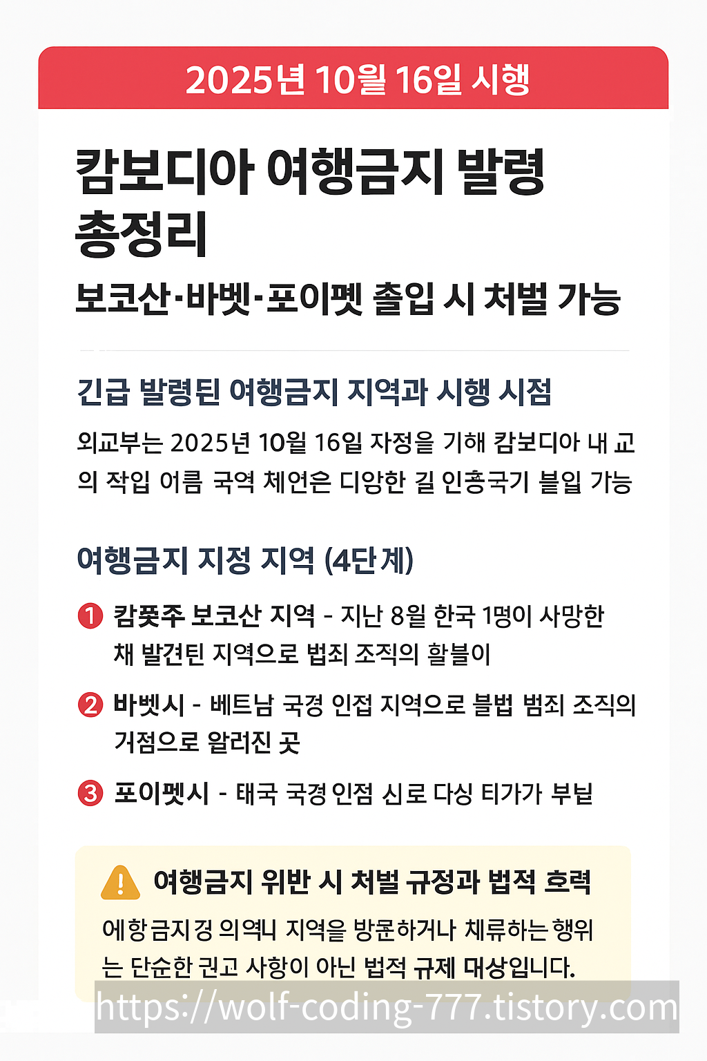 외교부는 2025년 10월 16일 자정을 기해 캄보디아 내 세 곳의 특정 지역을 여행금지 지역으로 공식 지정했습니다. 이는 우리나라 여행경보 체계에서 가장 높은 4단계에 해당하는 조치로, 해당 지역으로의 여행이 법적으로 금지됩니다.