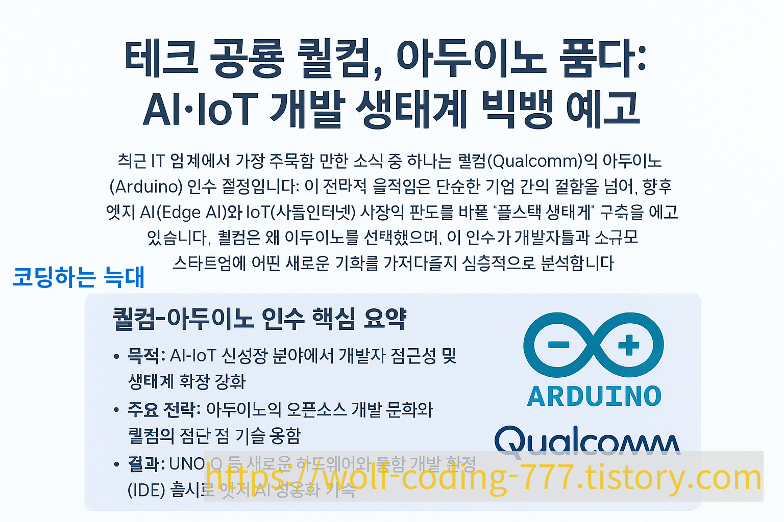 최근 IT 업계에서 가장 주목할 만한 소식 중 하나는 퀄컴(Qualcomm)의 아두이노(Arduino) 인수 결정입니다. 이 전략적 움직임은 단순한 기업 간의 결합을 넘어, 향후 엣지 AI(Edge AI)와 IoT(사물인터넷) 시장의 판도를 바꿀 '풀스택 생태계' 구축을 예고하고 있습니다. 퀄컴은 왜 아두이노를 선택했으며, 이 인수가 개발자들과 소규모 스타트업에 어떤 새로운 기회를 가져다줄지 심층적으로 분석합니다.