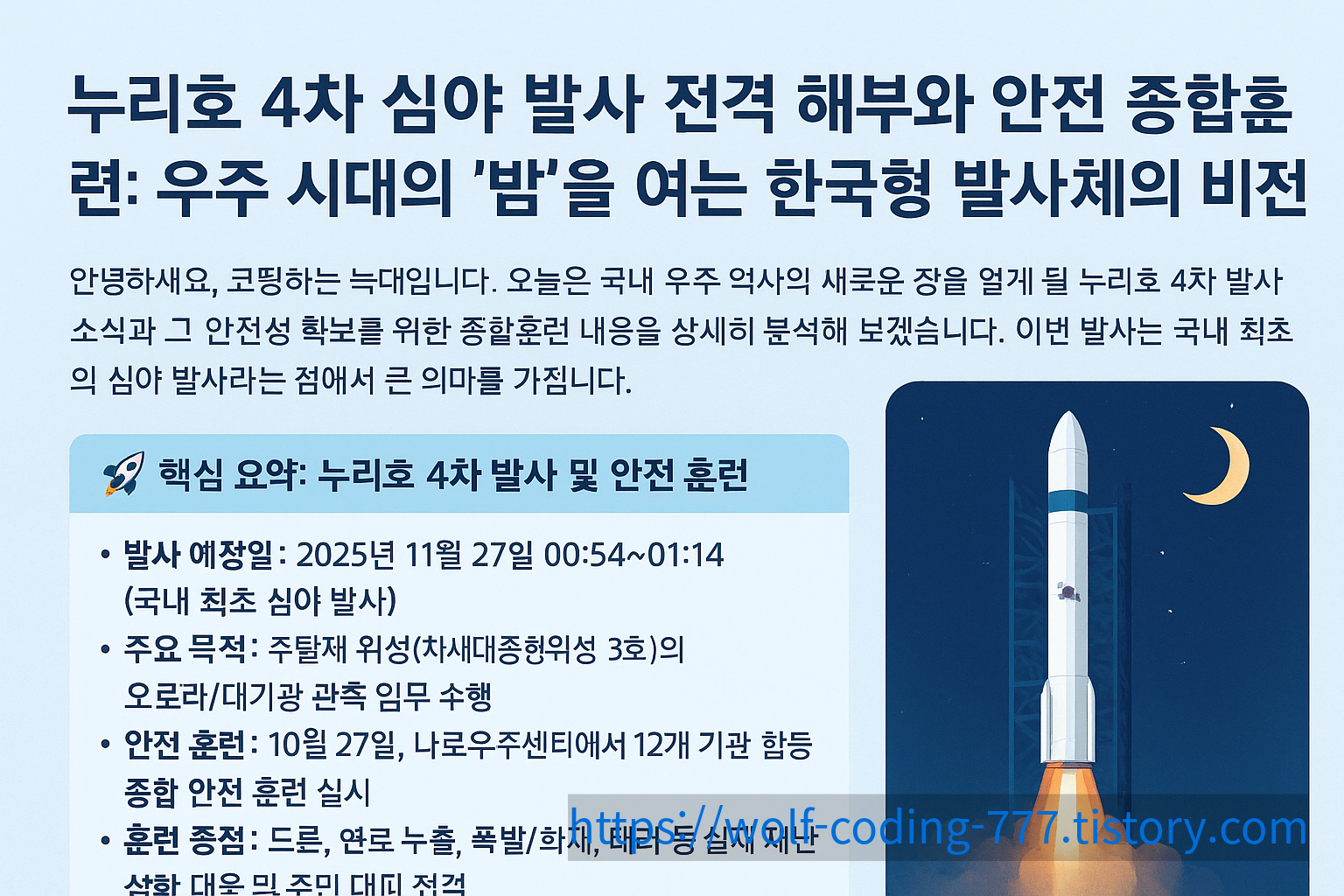 안녕하세요, 코딩하는 늑대입니다. 오늘은 국내 우주 역사의 새로운 장을 열게 될 누리호 4차 발사 소식과 그 안전성 확보를 위한 종합훈련 내용을 상세히 분석해 보겠습니다. 이번 발사는 국내 최초의 심야 발사라는 점에서 큰 의미를 가집니다.