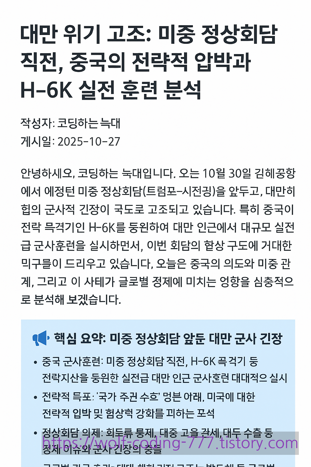 안녕하세요, 코딩하는 늑대입니다. 오는 **10월 30일 김해공항**에서 예정된 미중 정상회담(트럼프-시진핑)을 앞두고, 대만 해협의 군사적 긴장이 극도로 고조되고 있습니다. 특히 중국이 전략 폭격기인 **H-6K**를 동원하여 대만 인근에서 대규모 실전급 군사훈련을 실시하면서, 이번 회담의 협상 구도에 거대한 먹구름이 드리우고 있습니다. 오늘은 중국의 의도와 미중 관계, 그리고 이 사태가 글로벌 경제에 미치는 영향을 심층적으로 분석해 보겠습니다.