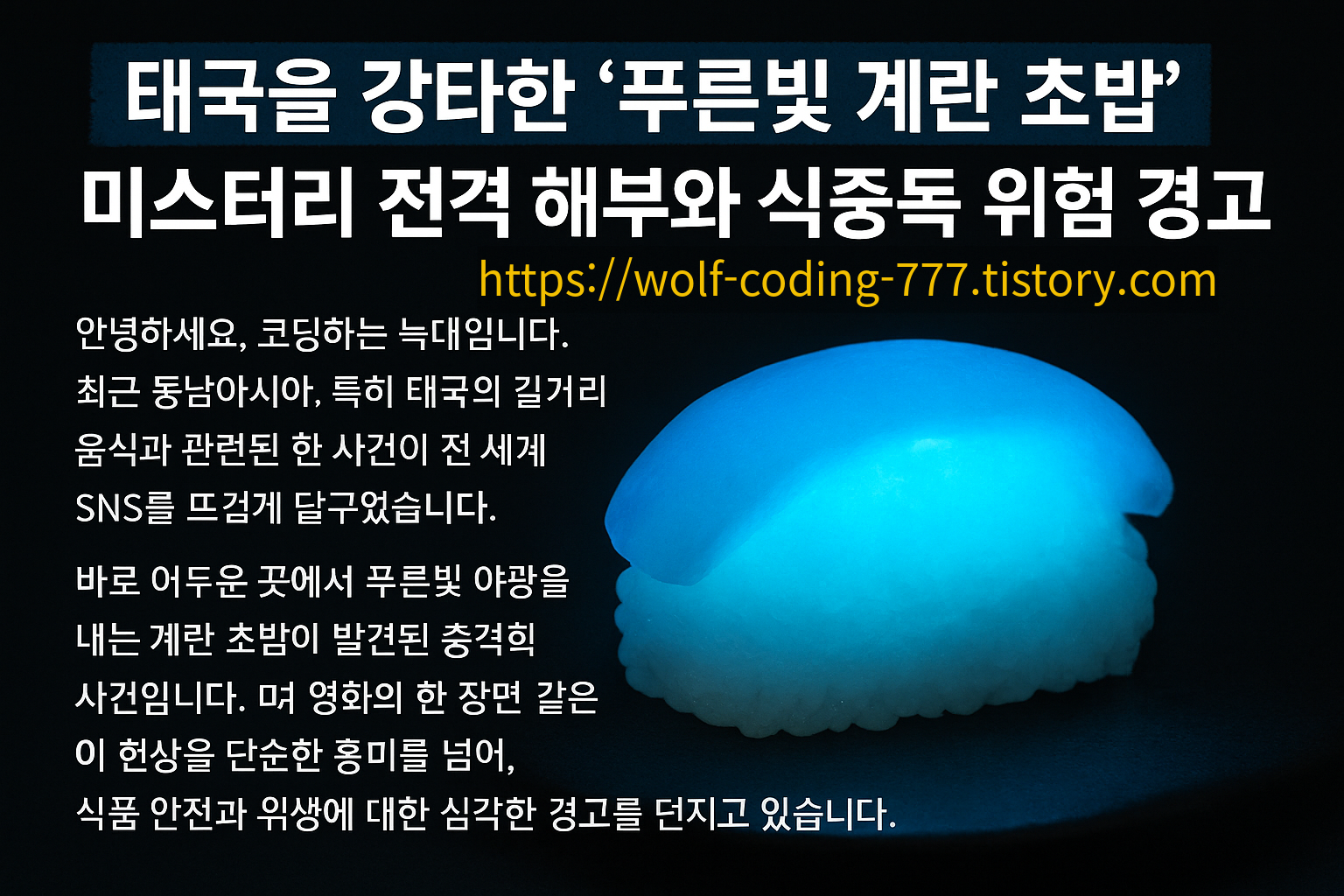 안녕하세요, 코딩하는 늑대입니다. 최근 동남아시아, 특히 태국의 길거리 음식과 관련된 한 사건이 전 세계 SNS를 뜨겁게 달구았습니다. 바로 어두운 곳에서 **푸른빛 야광을 내는 계란 초밥**이 발견된 충격적인 사건입니다. 마치 영화의 한 장면 같은 이 현상은 단순한 흥미를 넘어, **식품 안전**과 **위생**에 대한 심각한 경고를 던지고 있습니다. 오늘 이 현상의 과학적 배경과 전문가들의 강력한 섭취 금지 이유를 자세히 분석해 보겠습니다.