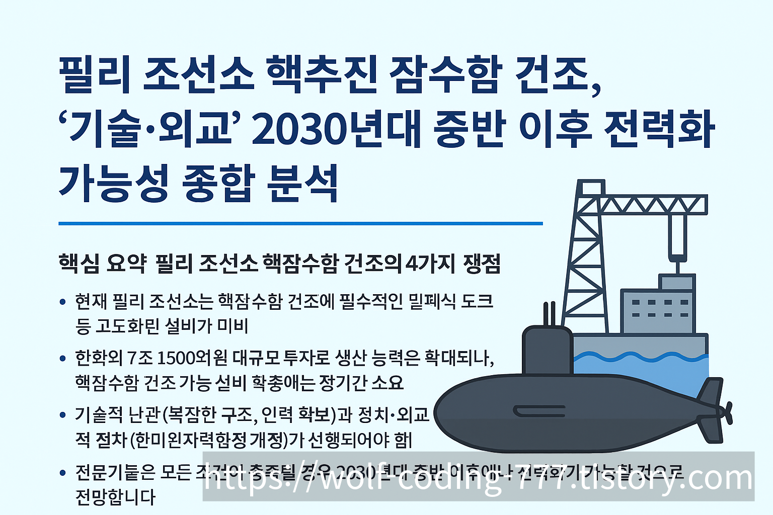 안녕하세요, 코딩하는 늑대입니다. 최근 한화그룹의 필리 조선소 (Philly Shipyard) 인수와 관련해 핵추진 잠수함 건조 가능성에 대한 관심이 높아지고 있습니다. 미국 펜실베이니아주에 위치한 필리 조선소는 과연 우리 해군의 핵추진 잠수함을 건조할 수 있을까요? 현재 시설 현황부터 기술적 과제, 정치·외교적 절차까지 종합적으로 살펴보겠습니다.