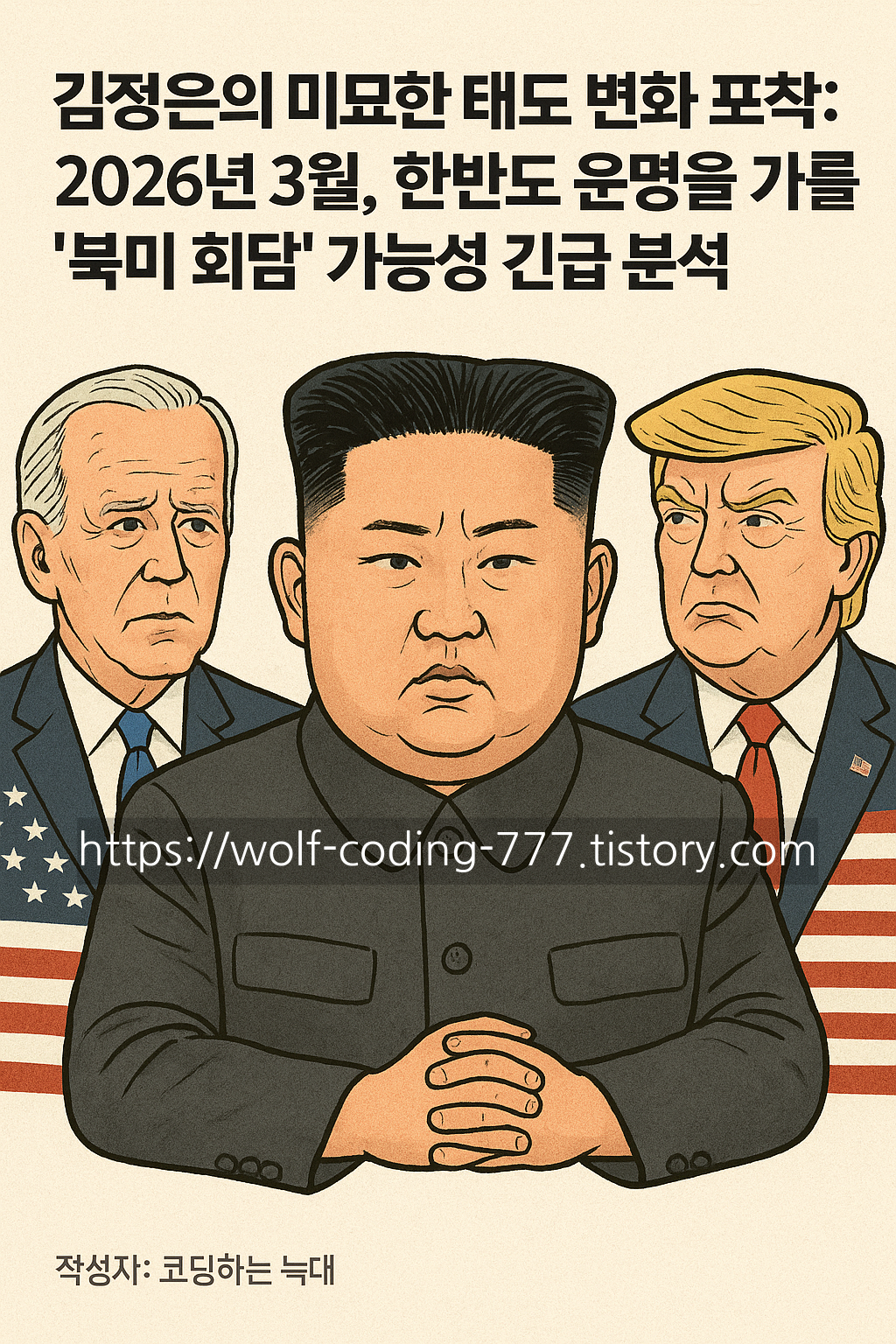 안녕하세요, 코딩하는 늑대입니다. 최근 국정원의 국회 정보위원회 보고서를 통해 2026년 3월 한미연합훈련 종료 직후 북미 정상회담이 재추진될 가능성이 매우 높다는 충격적인 전망이 나왔습니다. 단순한 희망 사항이 아닌, 북한 김정은 위원장의 구체적인 '물밑 준비' 정황이 포착되었다는 점에서 이 보고는 한반도 정세의 중대한 변화를 예고합니다. 과거와 달리 북한이 적극적인 대화 의지를 표명하고 있다는 국정원 분석의 핵심 내용을 심층적으로 파헤쳐 보겠습니다.