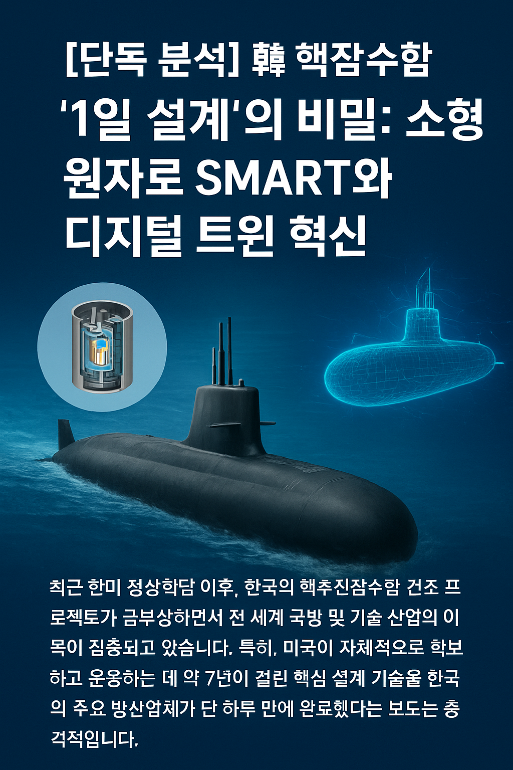 최근 한미 정상회담 이후, 한국의 핵추진잠수함 건조 프로젝트가 급물살을 타면서 전 세계 국방 및 기술 산업의 이목이 집중되고 있습니다. 특히, 미국이 자체적으로 확보하고 운용하는 데 약 7년이 걸린 핵심 설계 기술을 한국의 주요 방산업체가 단 하루 만에 완료했다는 보도는 충격적입니다. 이 놀라운 속도의 이면에는 무엇이 있을까요? 본 문서는 한국이 이미 수십 년간 축적해 온 소형 원자로(SMART) 기술, 첨단 디지털 트윈 인프라, 그리고 숙련된 엔지니어링 역량이 어떻게 이 '불가능해 보이는 성과'를 가능하게 했는지 심층적으로 분석합니다.